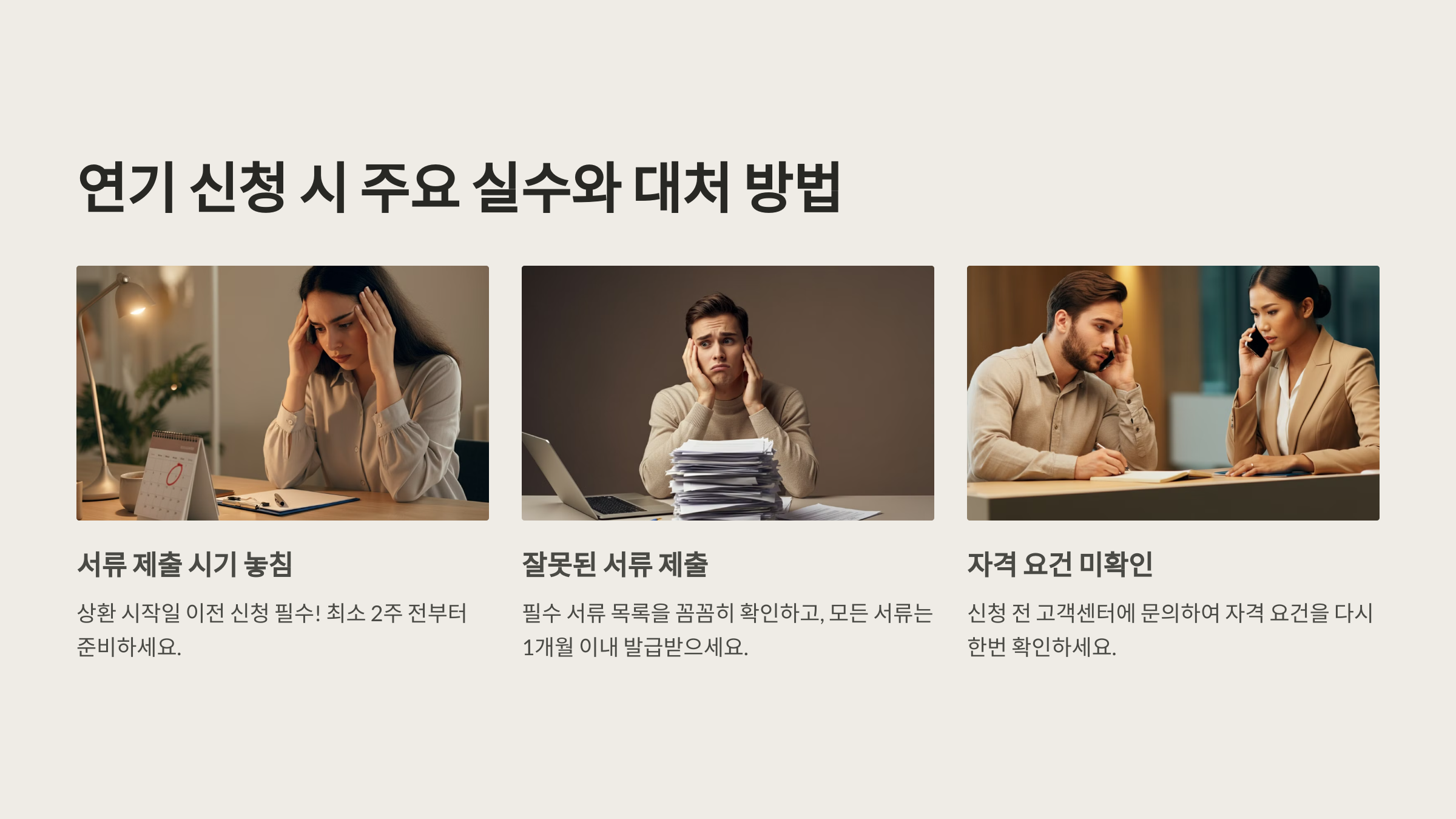 상환 연기 신청 과정에서 자주 발생하는 실수들이 있습니다. 가장 흔한 것은 서류 제출 시기를 놓치는 경우입니다. 연기 신청은 상환 시작일 이전에 해야 하며, 이미 연체가 발생한 후에는 처리가 복잡해질 수 있습니다. 또한 잘못된 서류를 제출하거나 필수 서류가 누락되는 경우도 많습니다. 특히 소득증빙서류나 재학증명서의 유효기간을 확인하지 않아 반려되는 사례가 있습니다.