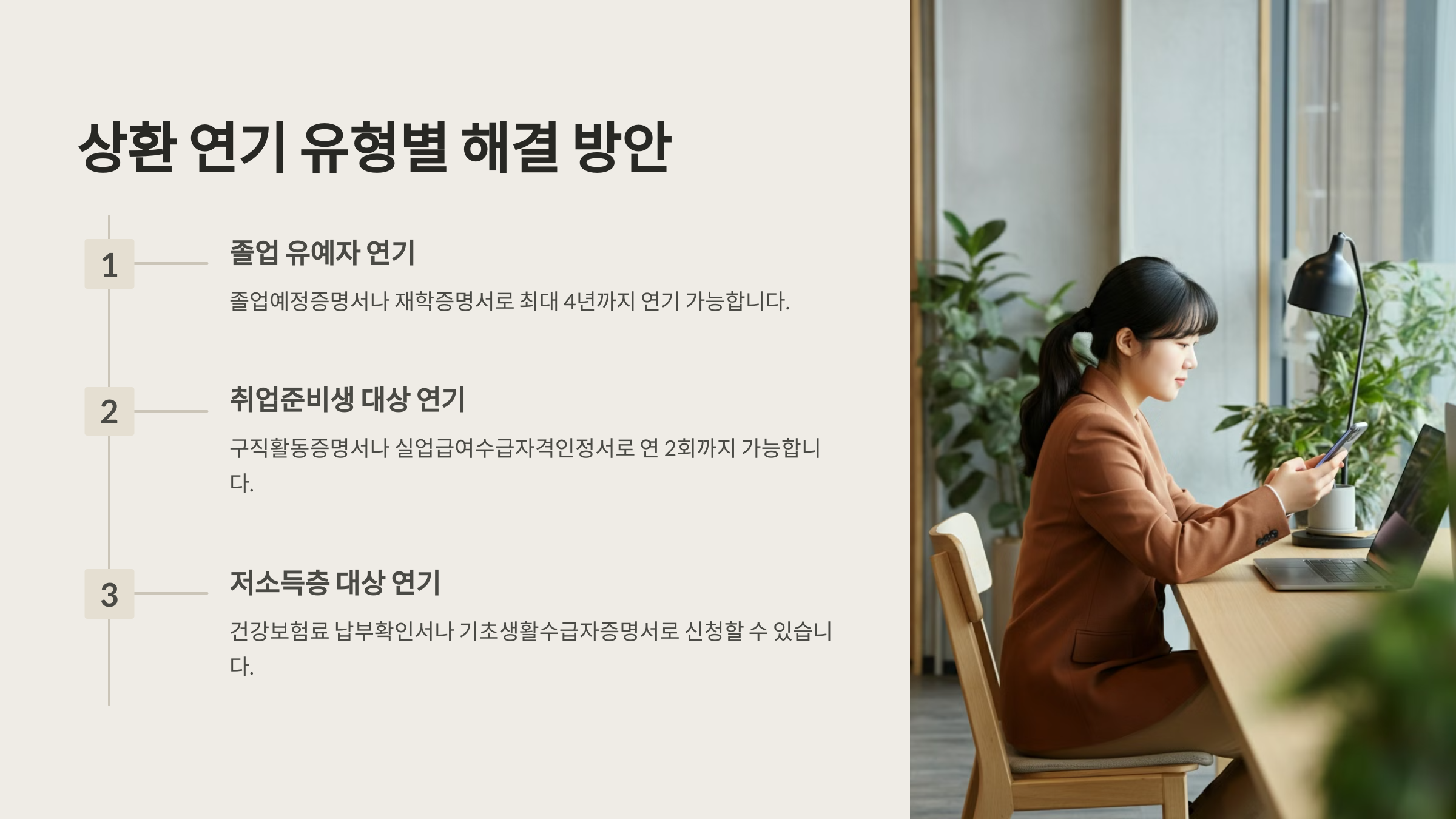 학자금 대출의 상환 연기는 크게 세 가지 유형으로 나눌 수 있습니다. 첫째, 졸업 유예자를 위한 연기로, 졸업예정증명서나 재학증명서를 통해 최대 4년까지 연기가 가능합니다. 둘째, 취업준비생 대상 연기로, 구직활동증명서나 실업급여수급자격인정서를 제출하면 연 2회까지 가능합니다. 셋째, 저소득층 대상 연기로, 건강보험료 납부확인서나 기초생활수급자증명서를 통해 신청할 수 있습니다.