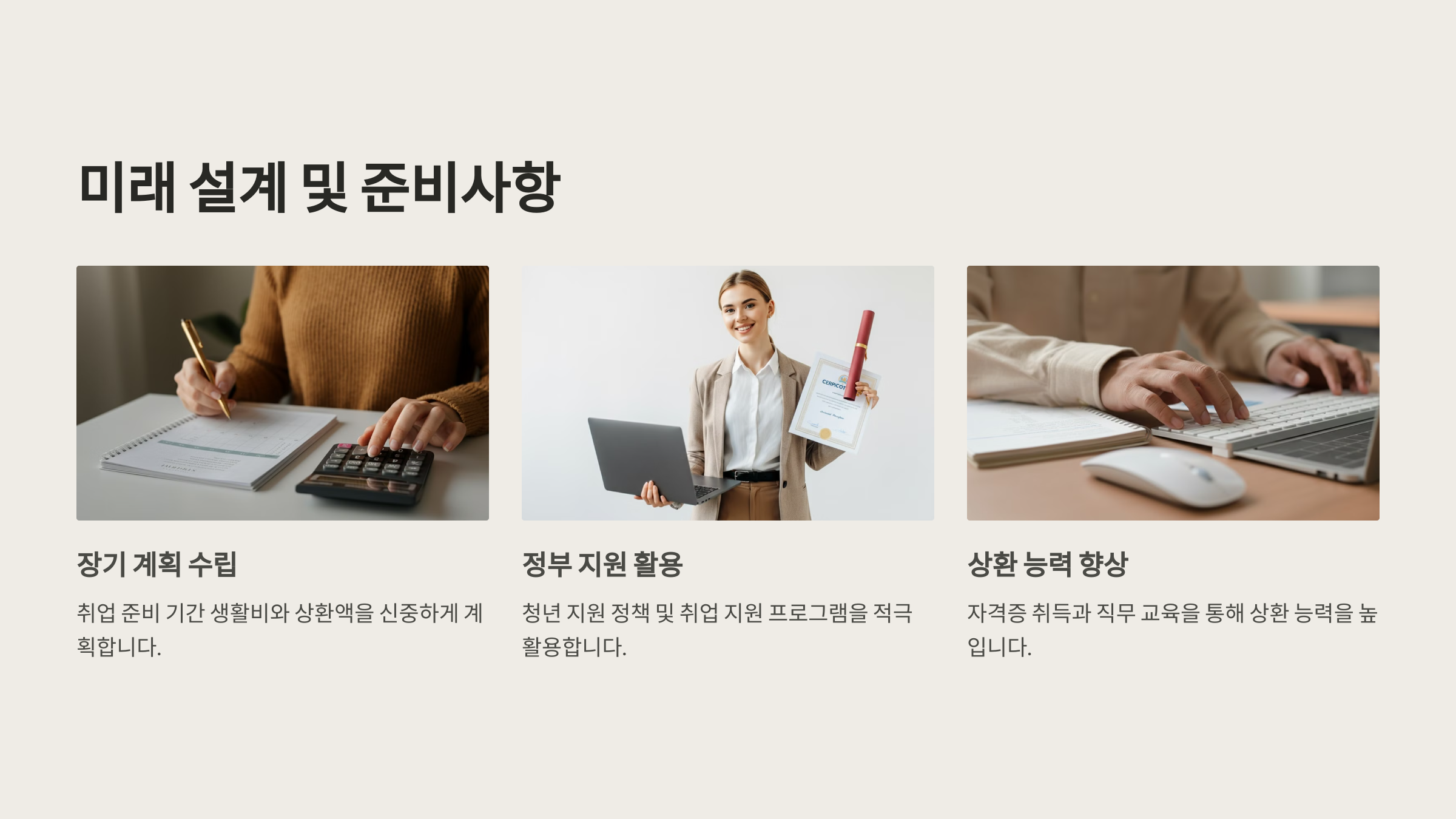학자금 대출 상환은 장기적인 계획이 필요합니다. 첫째, 취업 준비 기간 동안의 생활비와 상환액을 미리 계산하여 준비합니다. 둘째, 정부의 청년 지원 정책이나 취업 지원 프로그램을 적극 활용합니다. 셋째, 상환 능력 향상을 위한 자격증 취득이나 직무 교육에 투자합니다. 특히 최근에는 기업들의 청년 채용 지원이 확대되고 있으므로, 이러한 기회를 활용하는 것도 좋은 방법입니다.