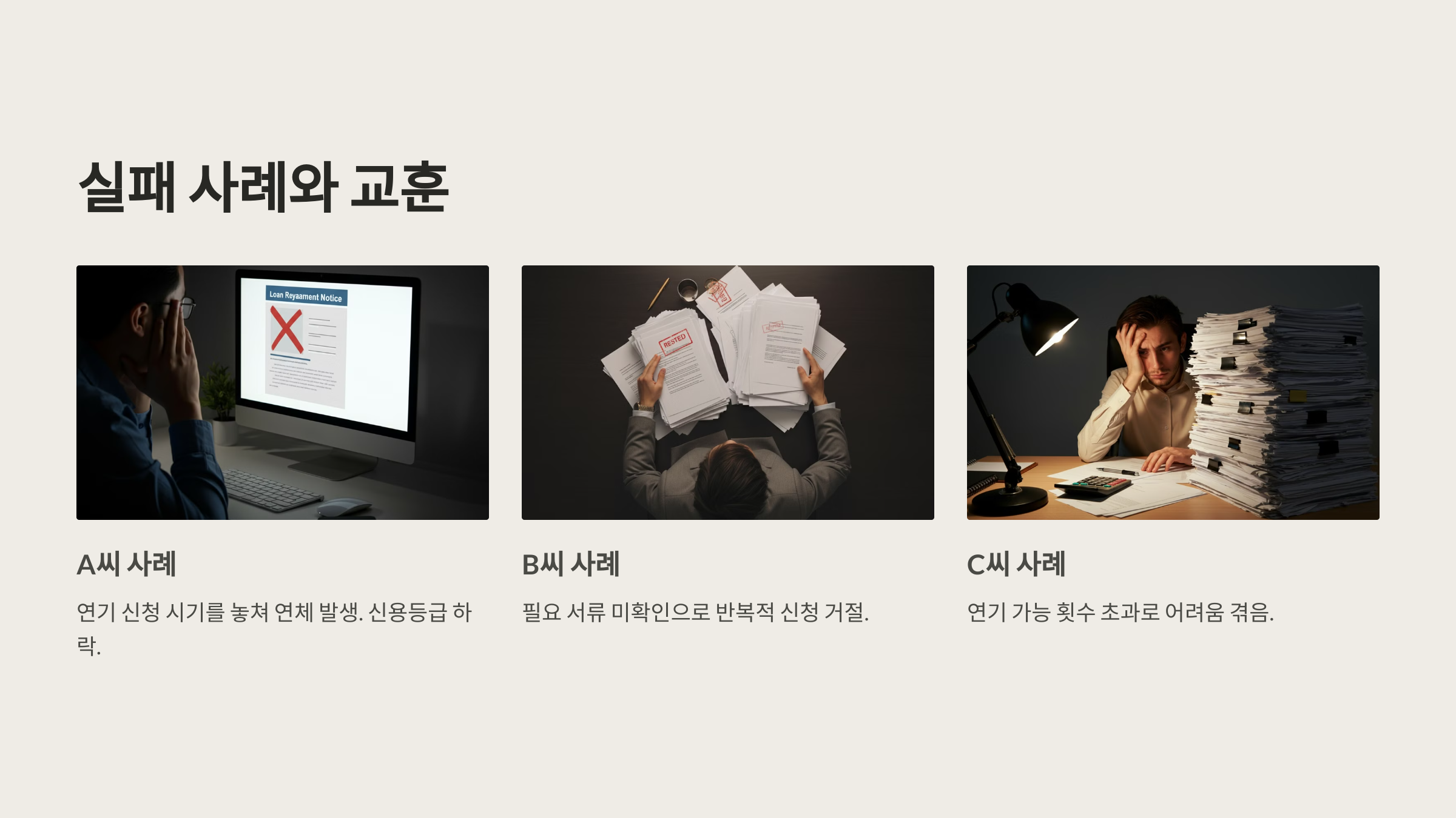 상환 연기 실패 사례를 통해 중요한 교훈을 얻을 수 있습니다. A씨는 연기 신청 시기를 놓쳐 연체가 발생했고, 이로 인해 신용등급이 하락했습니다. B씨는 필요 서류를 제대로 확인하지 않아 반복적으로 신청이 거절되었습니다. C씨의 경우 연기 가능 횟수를 초과하여 어려움을 겪었는데, 이는 초기에 상황을 제대로 파악하지 못한 결과였습니다.
