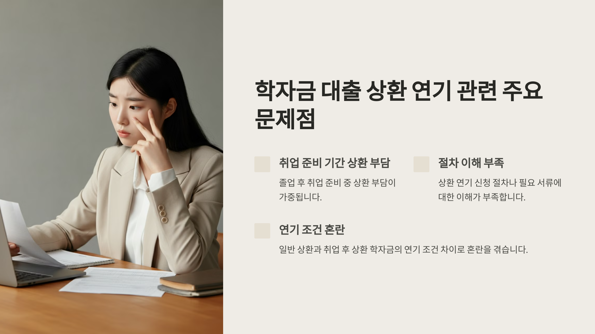 특히 최근에는 취업난으로 인해 상환 연기 수요가 증가하고 있습니다. 일부 졸업생들은 연기 신청 후 승인이 거절되어 어려움을 겪거나, 연기 기간 종료 후의 상환 계획 수립에 어려움을 겪고 있습니다. 또한 군 복무나 진학, 해외 연수 등 특수한 상황에서의 연기 절차에 대한 이해도 부족한 상황입니다.