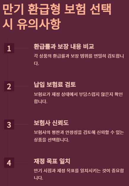 보험료와 환급률의 균형을 고려하고, 보장 내용이 재정 목표에 부합하는지 검토한 뒤 상품을 선택하는 것이 중요합니다.