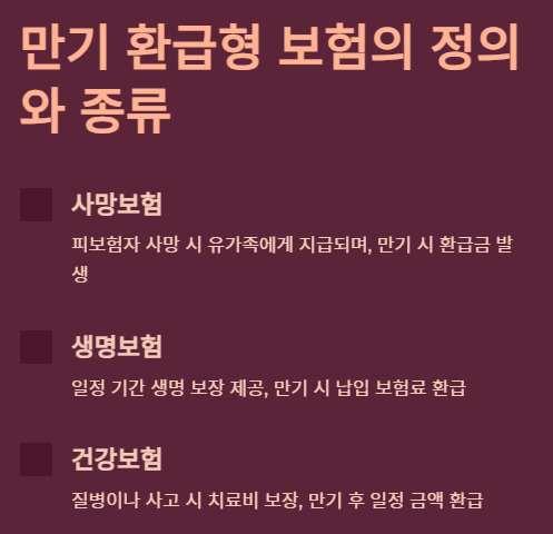 만기 환급형 보험은 계약 만료 시점에 그동안 납입한 보험료의 일부 혹은 전부를 돌려주는 상품으로, 보장성과 저축의 기능을 모두 갖추고 있습니다. 이 보험은 주로 다음과 같은 종류로 나뉩니다: