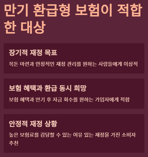 - 보험 혜택과 환급을 동시에 원하는 경우: 일정 기간 동안 보험 혜택을 받고 만기 후 자금을 회수하고자 하는 가입자에게 적합합니다.