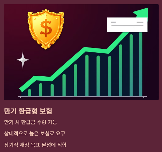 - 생명보험: 일정 기간 동안 생명 보장을 제공하며, 만기 시 납입한 보험료의 환급을 보장합니다.
