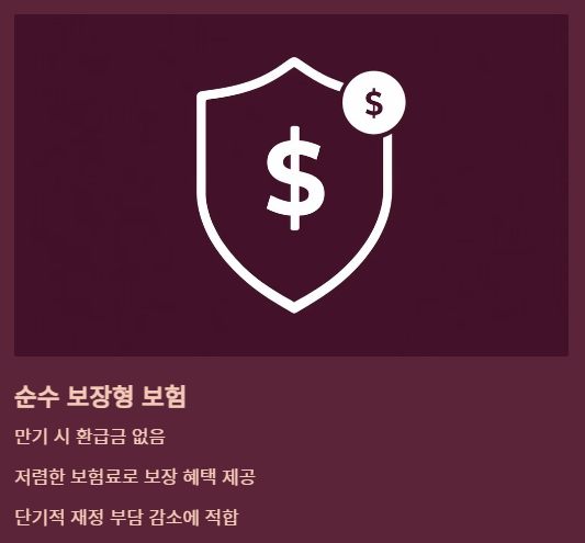 - 순수 보장형 보험: 만기 시 환급금이 없으며, 저렴한 보험료로 보장 혜택을 제공합니다.