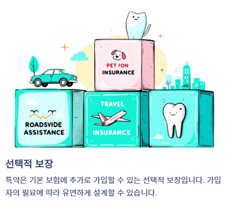 특약은 기본 보험에 추가로 가입할 수 있는 선택적 보장으로, 가입자의 필요에 따라 유연하게 설계할 수 있습니다. 예를 들어, 자동차 보험에 긴급 출동 서비스를 추가하거나, 생명보험에 특정 질병 보장을 추가하는 것이 특약에 해당합니다.