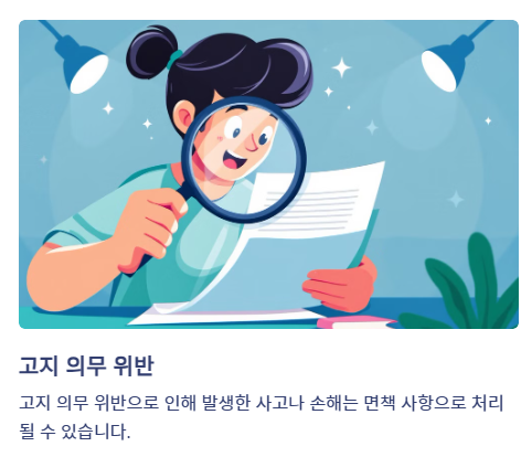 또한, 고지 의무 위반으로 인해 발생한 사고나 손해 역시 면책 사항으로 처리될 가능성이 높습니다. 따라서 계약 전 약관을 철저히 검토하여 면책 사항에 해당하지 않도록 주의해야 하며, 면책 사항 조건을 이해하지 못한 경우 예상하지 못한 재정 손실을 겪을 수 있습니다.