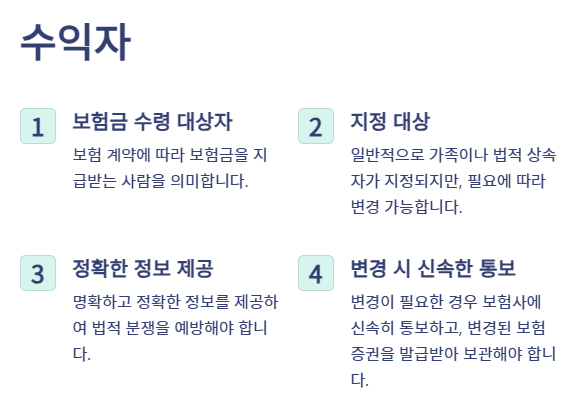 수익자는 보험 계약에 따라 보험금을 지급받는 대상자를 의미합니다. 생명보험의 경우 일반적으로 가족이나 법적 상속자가 수익자로 지정되지만, 필요에 따라 특정 개인이나 단체로 변경할 수 있습니다.