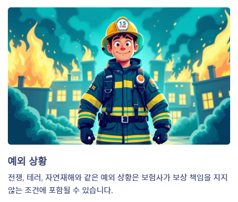 면책 사항은 보험사가 보상 책임을 지지 않는 조건을 말합니다. 약관에 따라 전쟁, 테러, 또는 자연재해와 같은 예외 상황이 면책 사항에 포함될 수 있습니다.