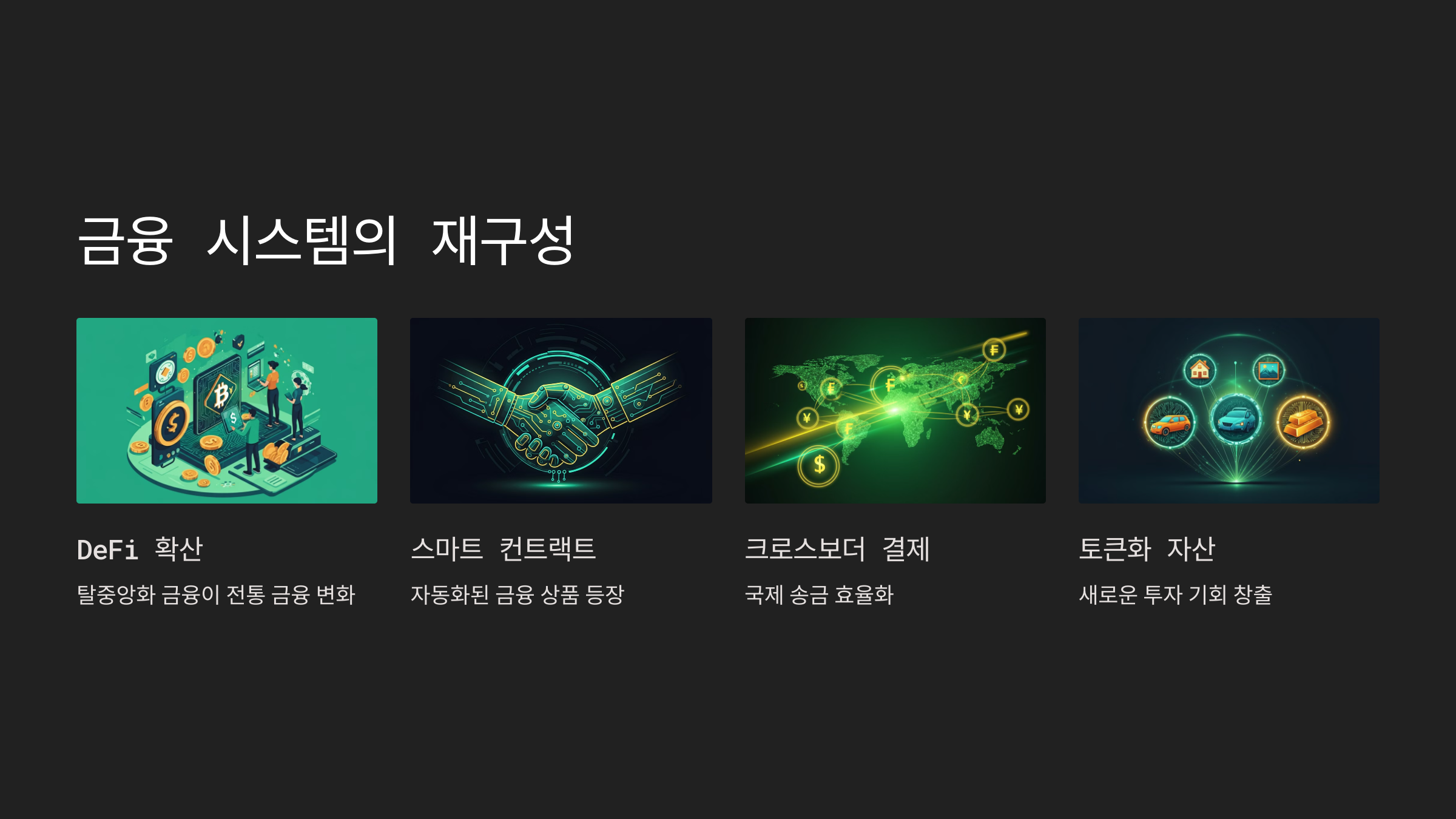 DeFi(탈중앙화 금융)가 전통 금융을 변화시키고 있습니다. 스마트 컨트랙트 기반의 금융 상품이 등장하고 있습니다. 자동화된 시장 조성자가 유동성을 제공하고 있습니다. 크로스보더 결제가 효율화되고 있습니다.
