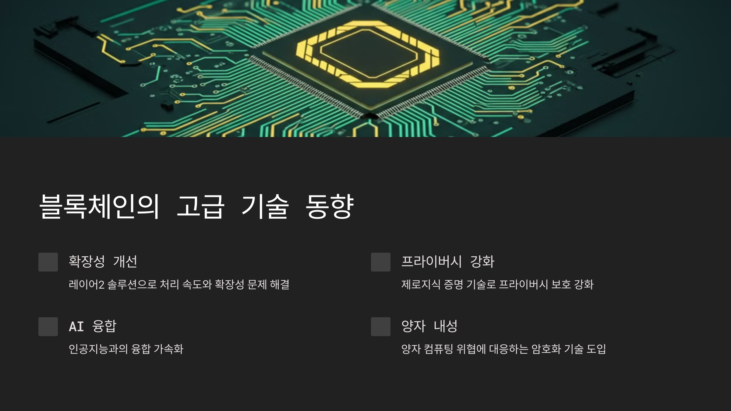 블록체인은 확장성과 상호운용성 측면에서 큰 진전을 이루고 있습니다. 레이어2 솔루션은 처리 속도와 확장성 문제를 해결하고 있습니다. 제로지식 증명 기술이 프라이버시 보호를 강화하고 있습니다. 인공지능의 최신 발전과 비즈니스 활용 방안에서 언급된 AI와의 융합도 가속화되고 있습니다.