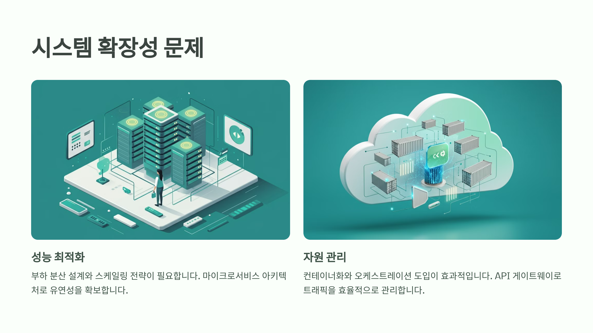 시스템 성능 병목 현상이 주요 과제입니다. 부하 분산 설계와 스케일링 전략이 필요합니다. 마이크로서비스 아키텍처 도입으로 유연성을 확보할 수 있습니다. 데이터베이스 파티셔닝과 샤딩으로 성능을 개선할 수 있습니다.