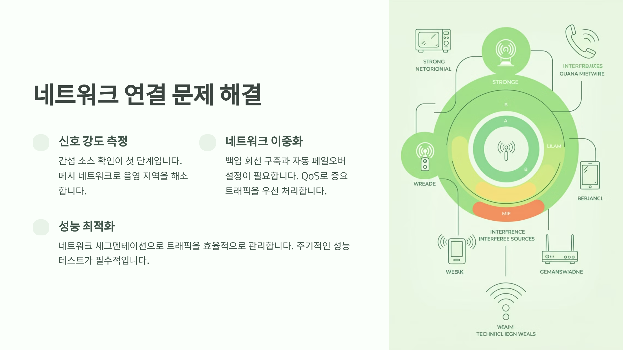 A: 신호 강도, 간섭 소스, 네트워크 혼잡도를 순차적으로 확인하고, 네트워크 분석 도구로 병목 구간을 찾아내야 합니다.