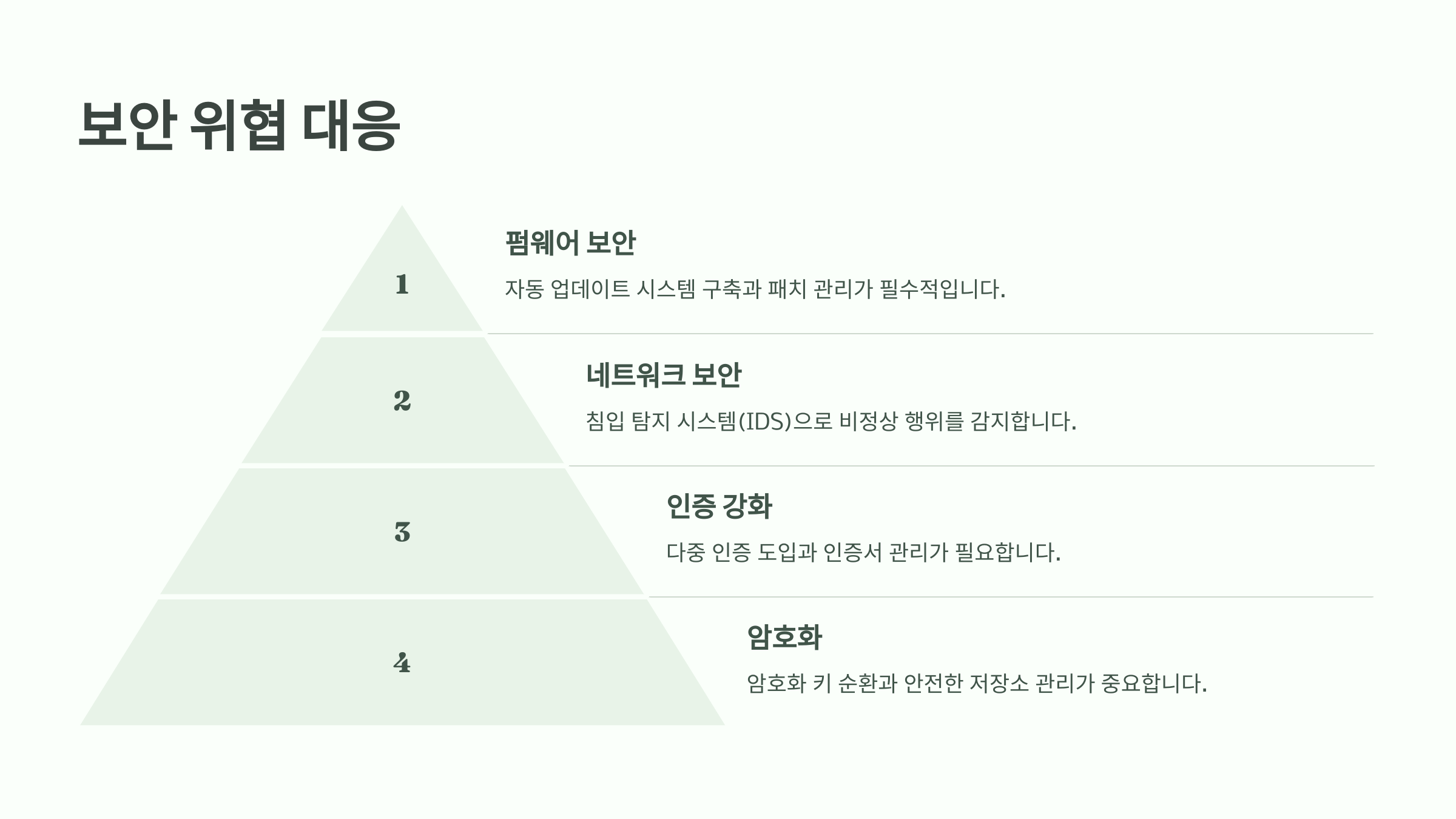 IoT 기기의 펌웨어 취약점이 주요 위험요소입니다. 자동 업데이트 시스템 구축과 패치 관리가 필수적입니다. 침입 탐지 시스템(IDS)으로 비정상 행위를 감지할 수 있습니다. 네트워크 격리와 접근 제어로 피해 확산을 방지할 수 있으며, 보안 설정 가이드를 참고하면 도움이 됩니다.