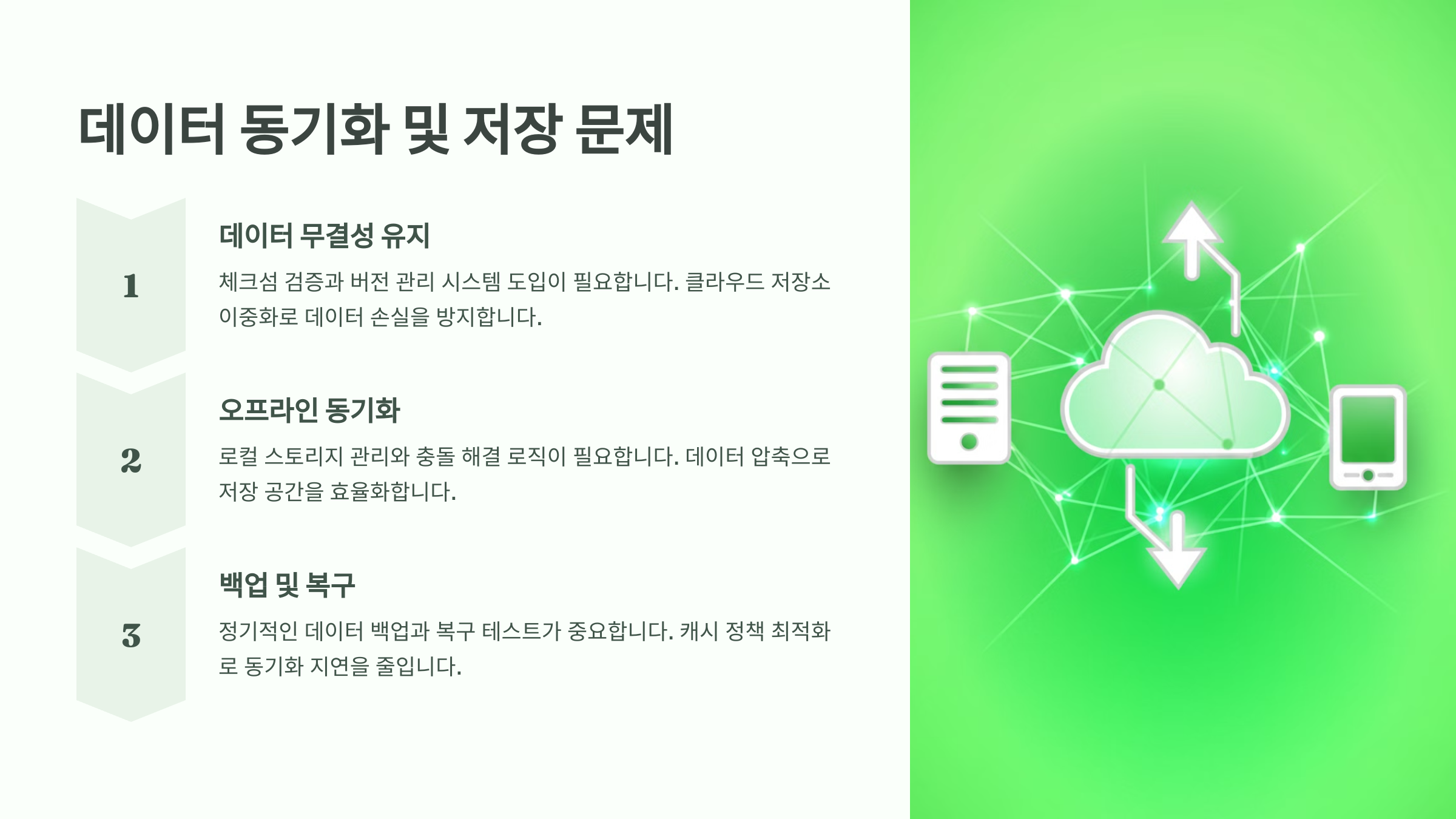 오프라인 동기화 메커니즘 구축이 필수적입니다. 로컬 스토리지 관리와 충돌 해결 로직이 필요합니다. 데이터 압축으로 저장 공간을 효율화할 수 있습니다. 정기적인 데이터 백업과 복구 테스트도 중요한 요소입니다.