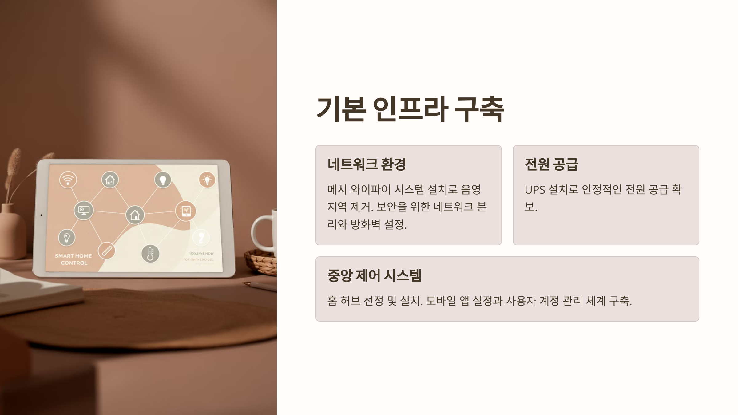 안정적인 네트워크 환경 구축이 최우선입니다. 메시 와이파이 시스템 설치로 음영 지역을 제거합니다. 보안을 위한 네트워크 분리와 방화벽 설정이 필요합니다. UPS 설치로 안정적인 전원 공급을 확보해야 합니다.