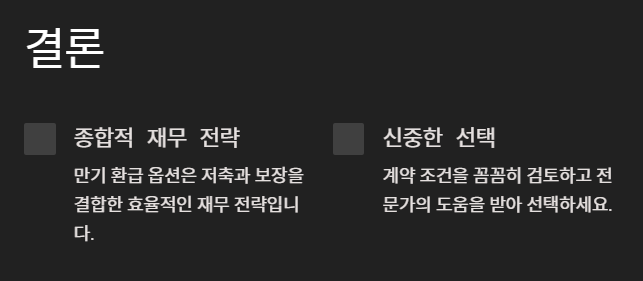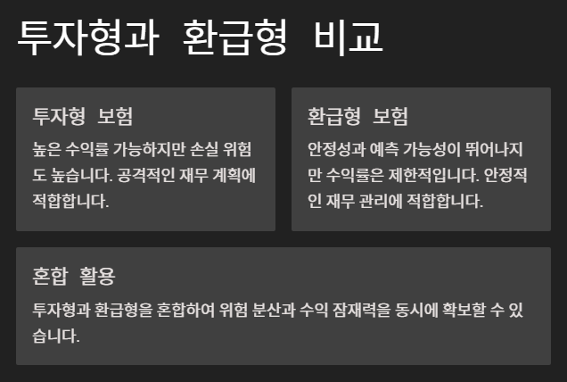 환급형은 안정성과 예측 가능성이 뛰어나지만, 수익률은 제한적입니다. 안정적인 재무 관리를 원하는 사람들에게 더 적합합니다. - 혼합 활용: