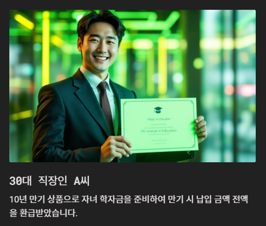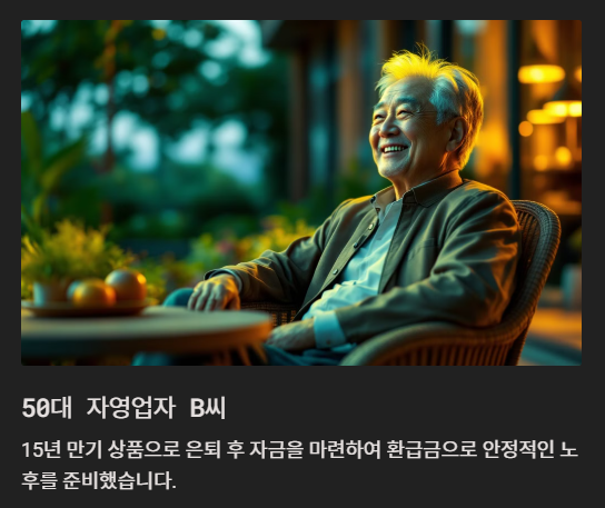 50대 자영업자 B씨는 15년 만기 상품으로 은퇴 후 자금을 마련했습니다. 환급금을 기반으로 생활비를 충당하며 안정적인 노후를 준비할 수 있었습니다.