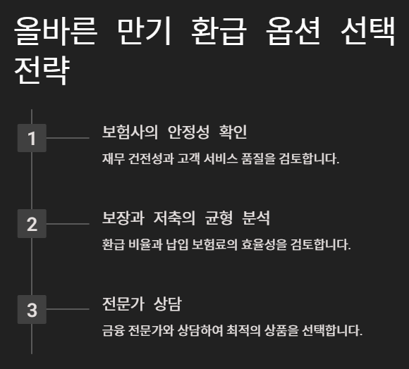 생명보험의 만기 환급 옵션을 선택할 때는 보험사의 신뢰성, 조건, 개인 재무 목표 등을 꼼꼼히 검토해야 합니다. 적절한 선택을 위해 다음과 같은 전략을 고려하세요.