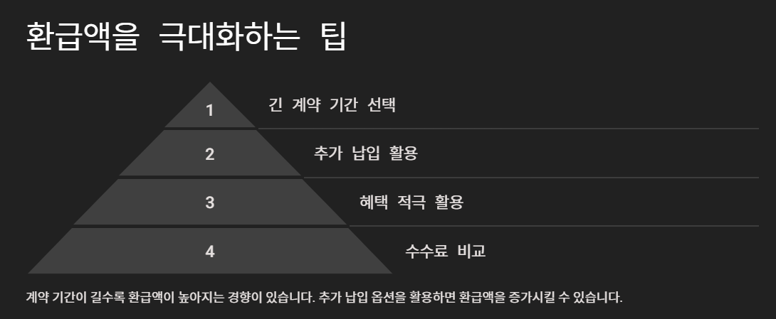 계약 기간이 길수록 환급액이 높아지는 경향이 있으므로, 가능한 한 장기적인 상품을 선택하세요. - 추가 납입 활용: