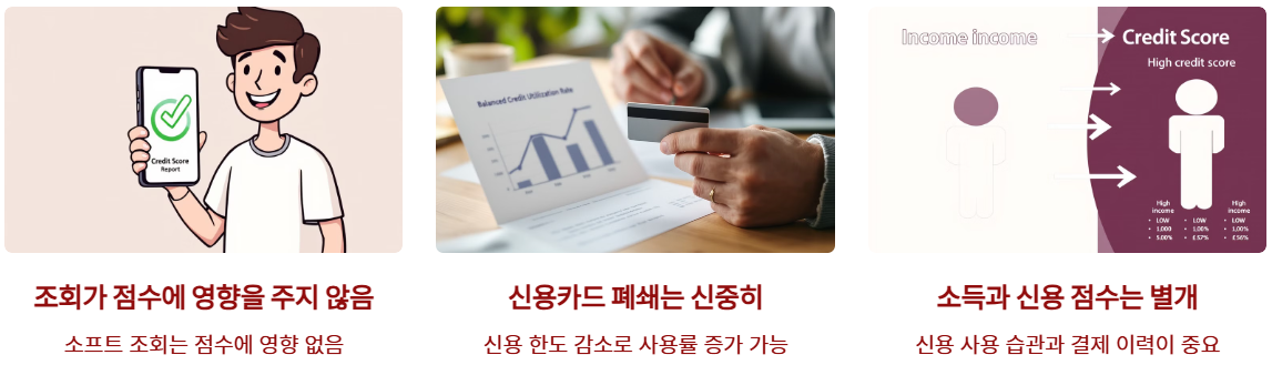 신용카드를 폐쇄하면 신용 한도가 줄어들어 신용 사용률이 높아질 수 있으므로 신중히 판단해야 합니다. - 높은 소득이 반드시 높은 신용 점수를 의미하지 않는다