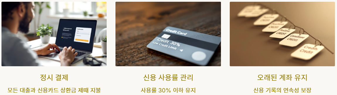 신용카드 사용 한도를 적절히 관리하여 사용률을 30% 이하로 유지하세요. 이는 대출 상환 능력을 보여주는 긍정적인 신호로 작용합니다. - 오래된 계좌 유지