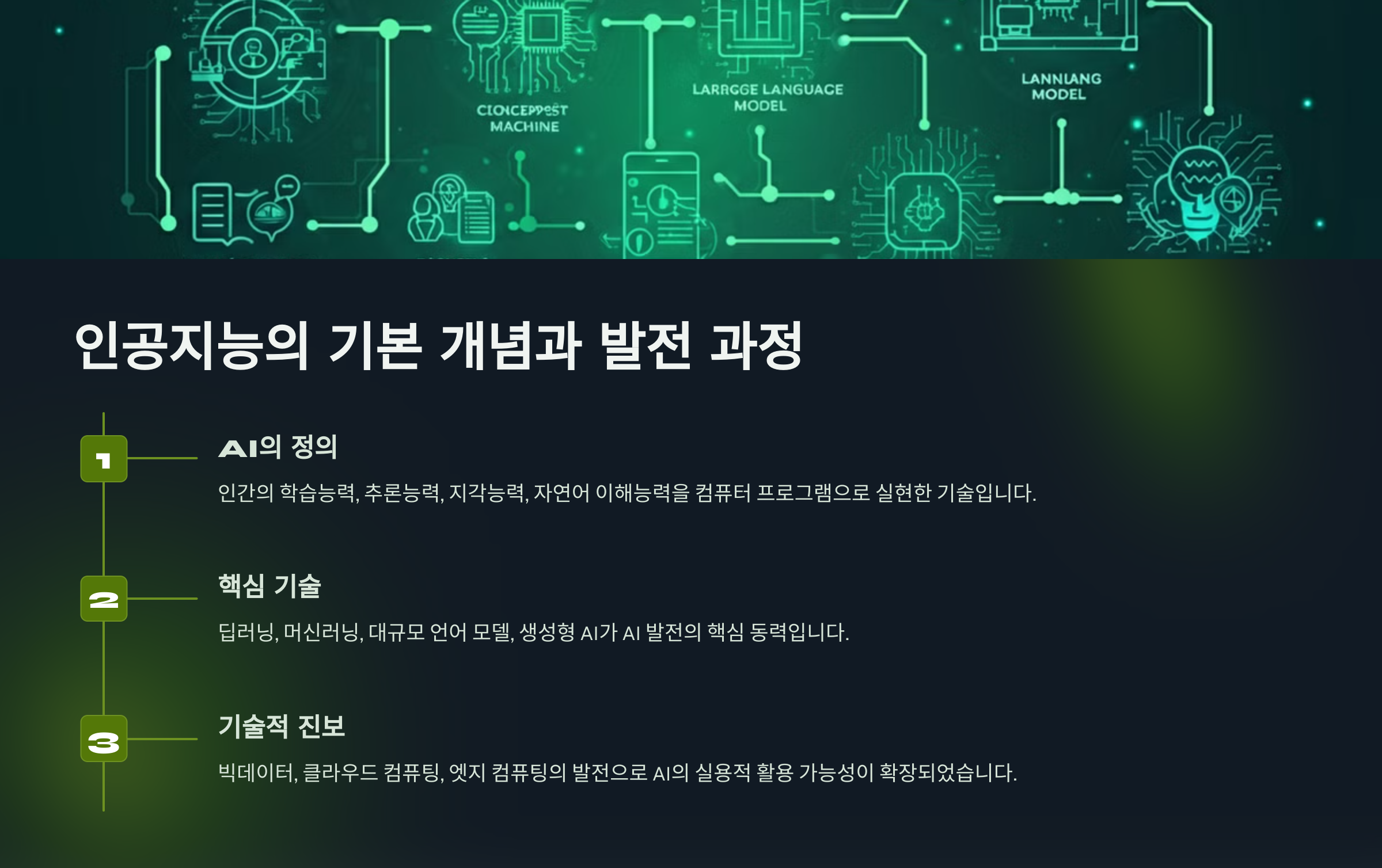인공지능은 인간의 학습능력과 추론능력, 지각능력, 자연어 이해능력 등을 컴퓨터 프로그램으로 실현한 기술입니다. 딥러닝과 머신러닝은 AI 발전의 핵심 동력이 되어왔습니다. 최근에는 대규모 언어 모델과 생성형 AI의 발전으로 새로운 전기를 맞이했습니다. AI 기술은 패턴 인식, 자연어 처리, 시각 정보 처리 등 다양한 분야에서 눈부신 발전을 이루고 있습니다.