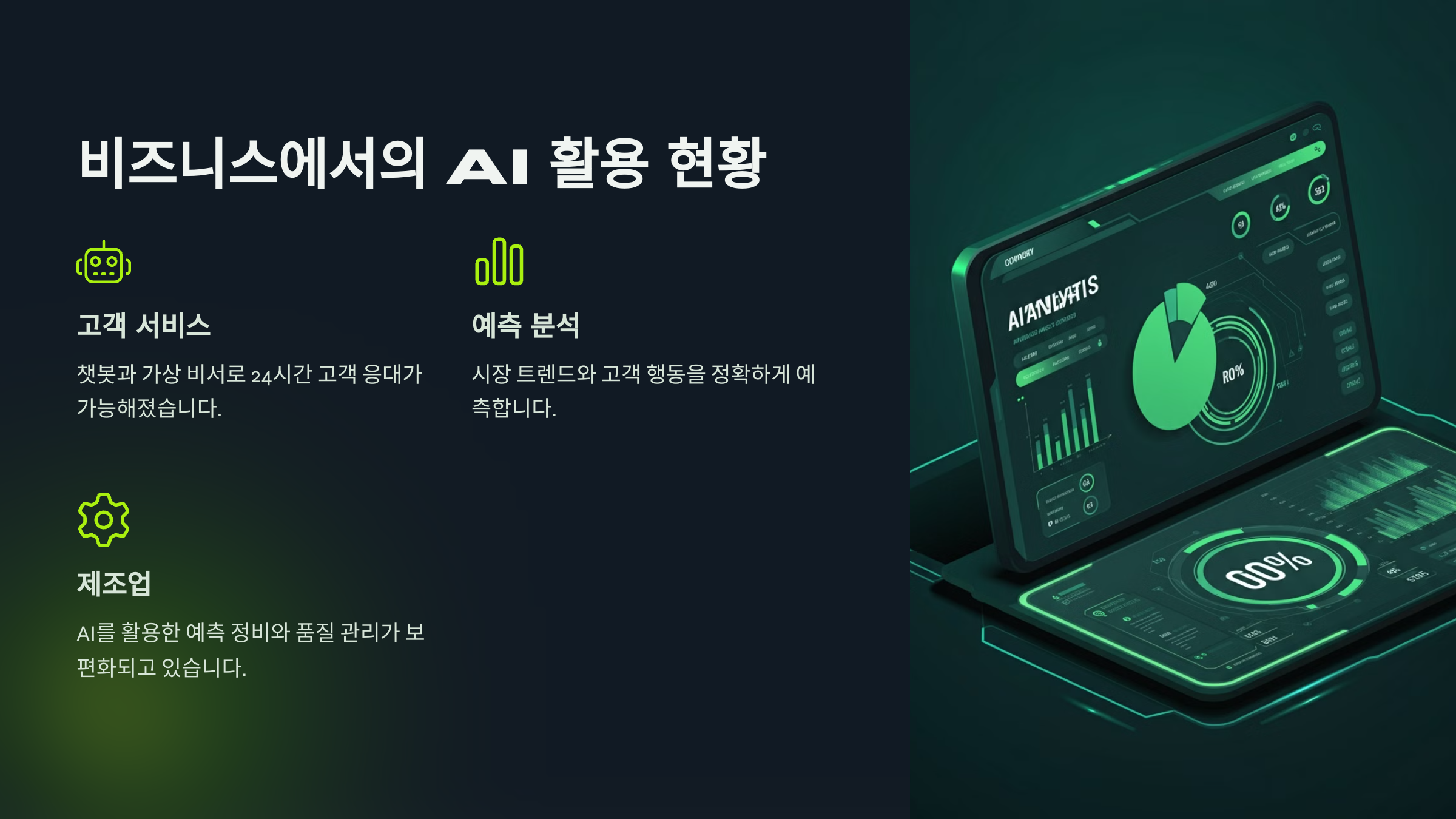 기업들은 AI를 통해 고객 서비스를 자동화하고 개인화된 경험을 제공하고 있습니다. 챗봇과 가상 비서는 24시간 고객 응대를 가능하게 만들었습니다. AI 기반 예측 분석은 시장 트렌드와 고객 행동을 정확하게 예측합니다. 자동화된 의사결정 시스템은 비즈니스 프로세스의 효율성을 극대화합니다.