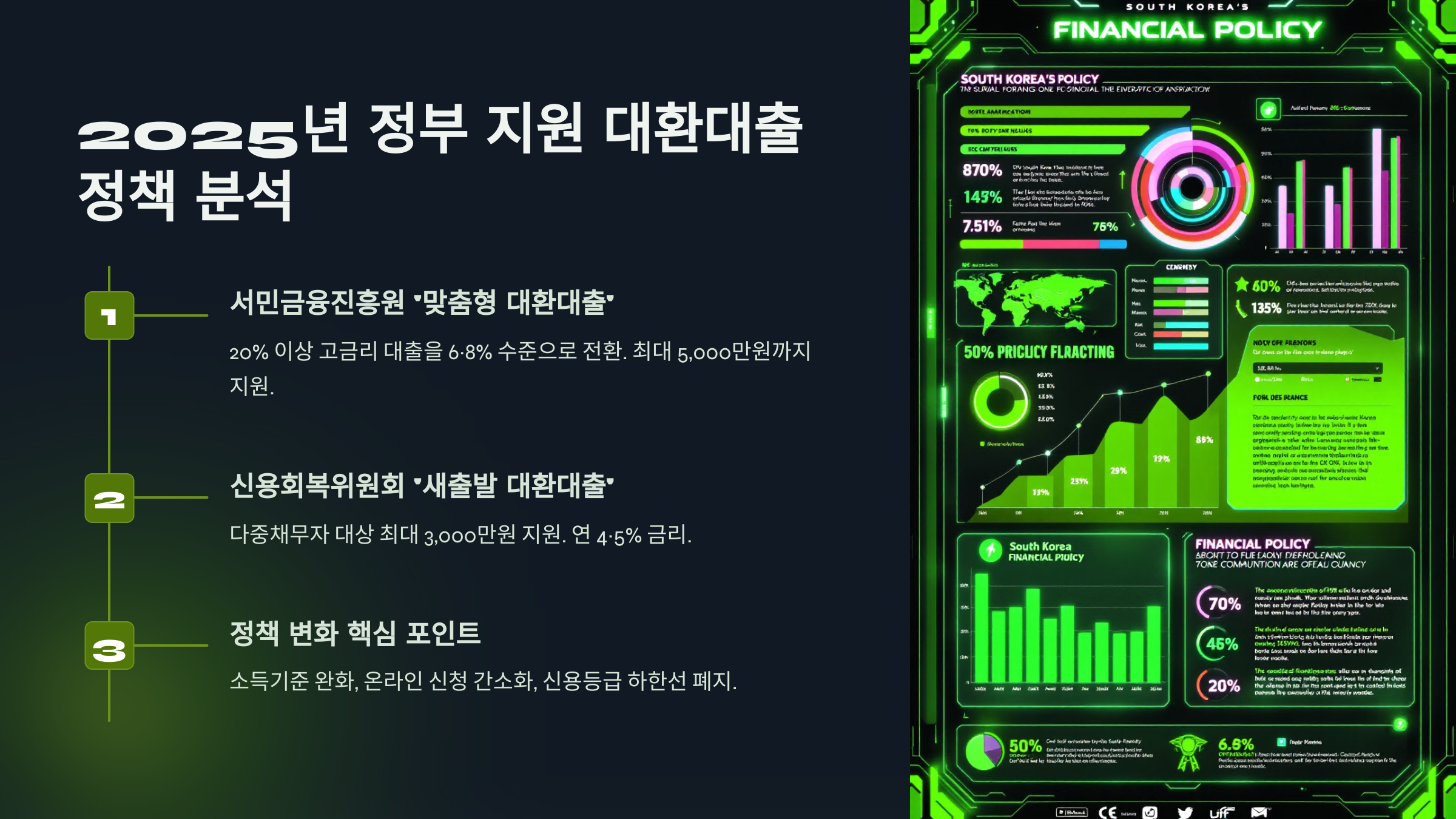 정책 변화의 핵심 포인트들이 있습니다. 첫째, 소득기준이 완화되어 중위소득 150% 이하까지 지원 대상이 확대되었습니다. 둘째, 온라인 신청 절차가 간소화되어 서류 준비가 수월해졌습니다. 셋째, 신용등급 하한선이 폐지되어 저신용자도 신청이 가능해졌습니다. 특히 무직자를 위한 특별 프로그램도 신설되어, 실업 상태에서도 대환대출이 가능해졌습니다.