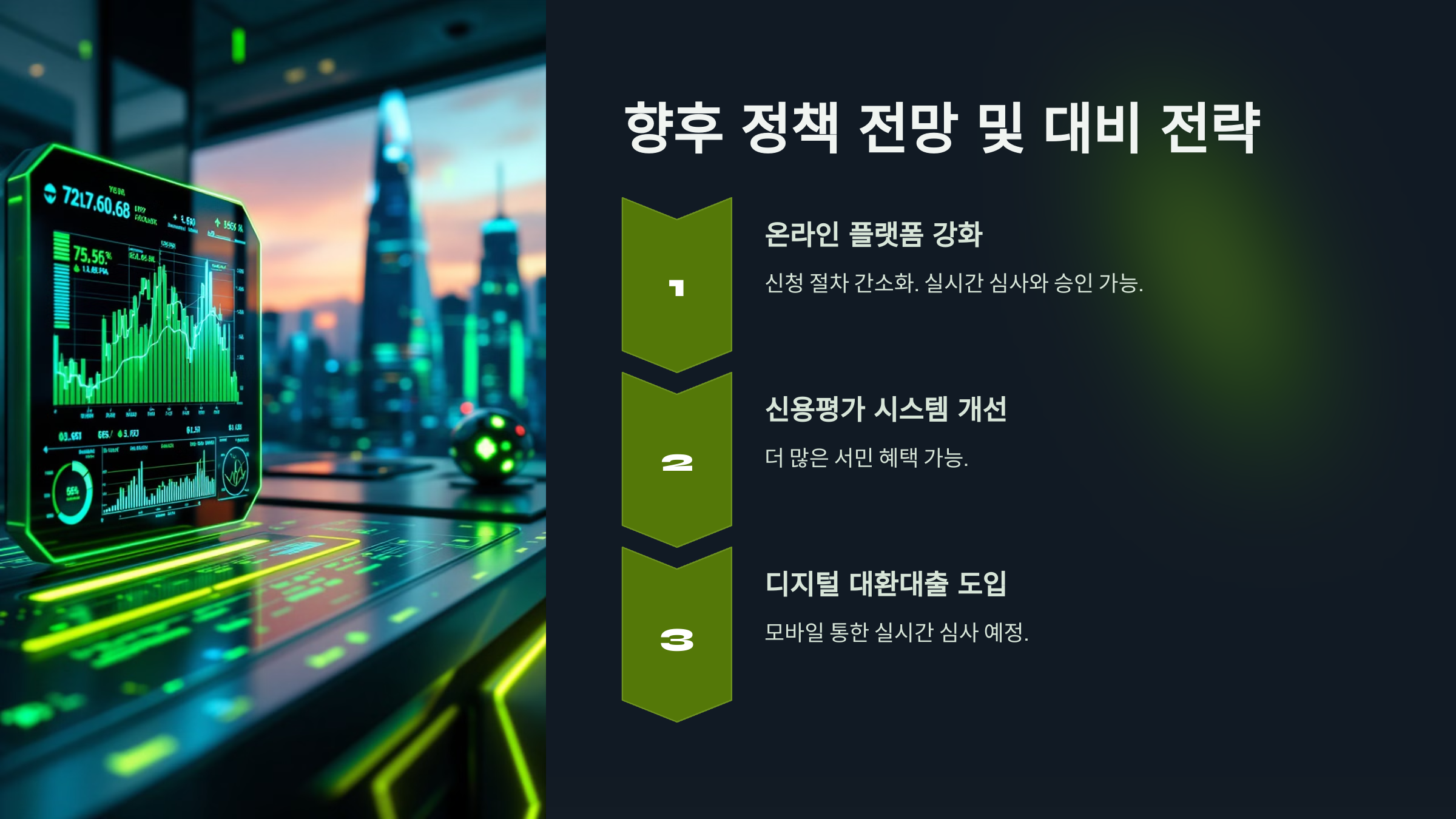 2024년 하반기부터 변화가 예상되는 정책들이 있습니다. 서민금융진흥원은 온라인 플랫폼을 강화하여 신청 절차를 더욱 간소화할 예정이며, 신용평가 시스템도 개선되어 더 많은 서민이 혜택을 받을 수 있게 됩니다. 또한 새로운 형태의 '디지털 대환대출'이 도입될 예정이어서, 모바일을 통한 실시간 심사와 승인이 가능해질 것으로 전망됩니다.