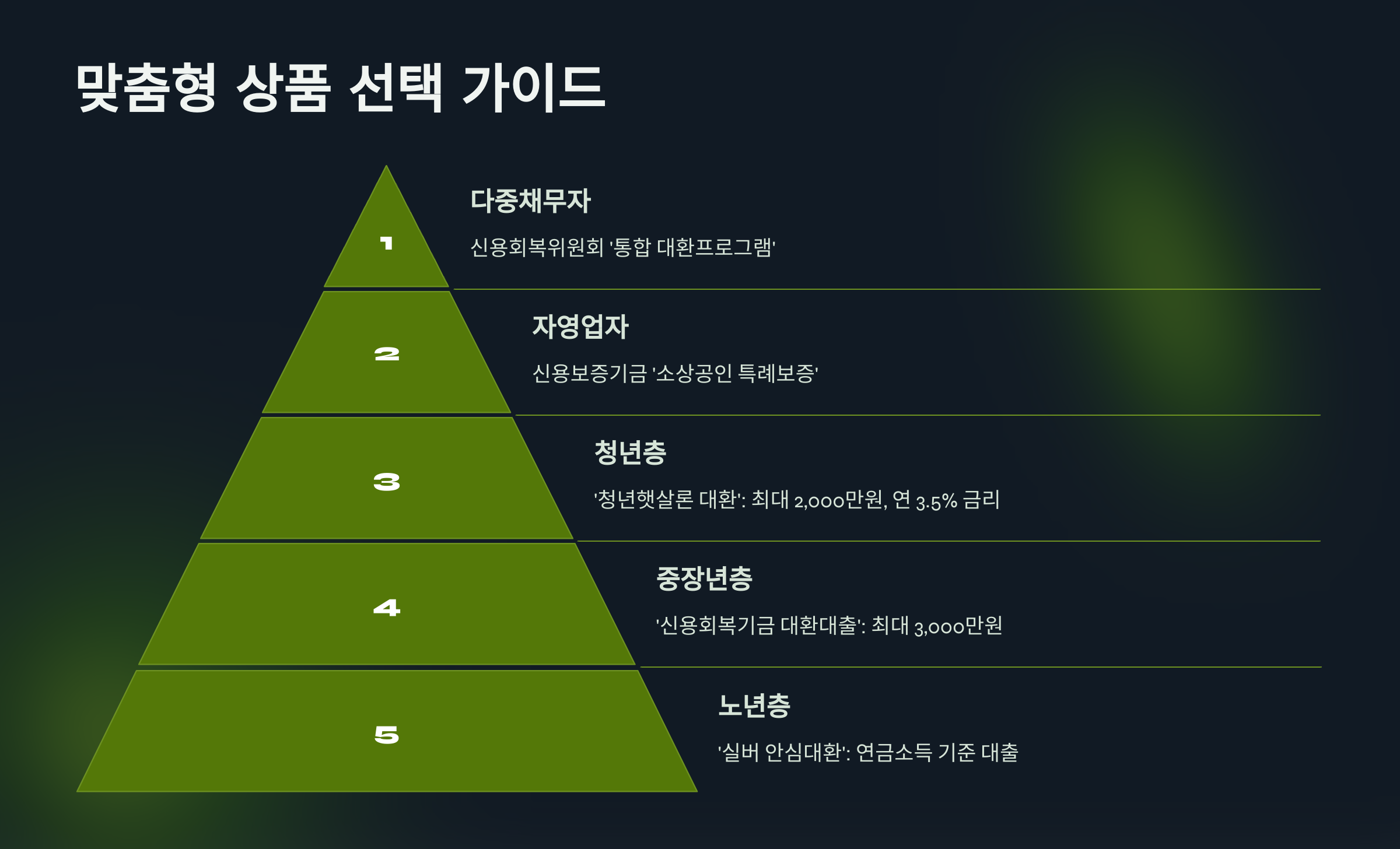 연령대별 맞춤 상품도 있습니다. 청년층(만 19~34세)은 '청년햇살론 대환'을 통해 최대 2,000만원까지 연 3.5% 금리로 전환할 수 있습니다. 중장년층은 '신용회복기금 대환대출'로 최대 3,000만원까지 지원받을 수 있으며, 특히 생계형 채무자의 경우 원금감면도 가능합니다. 노년층은 '실버 안심대환'을 통해 연금소득을 기준으로 한 대출이 가능하며, 담보가 있는 경우 더 유리한 조건을 적용받을 수 있습니다.