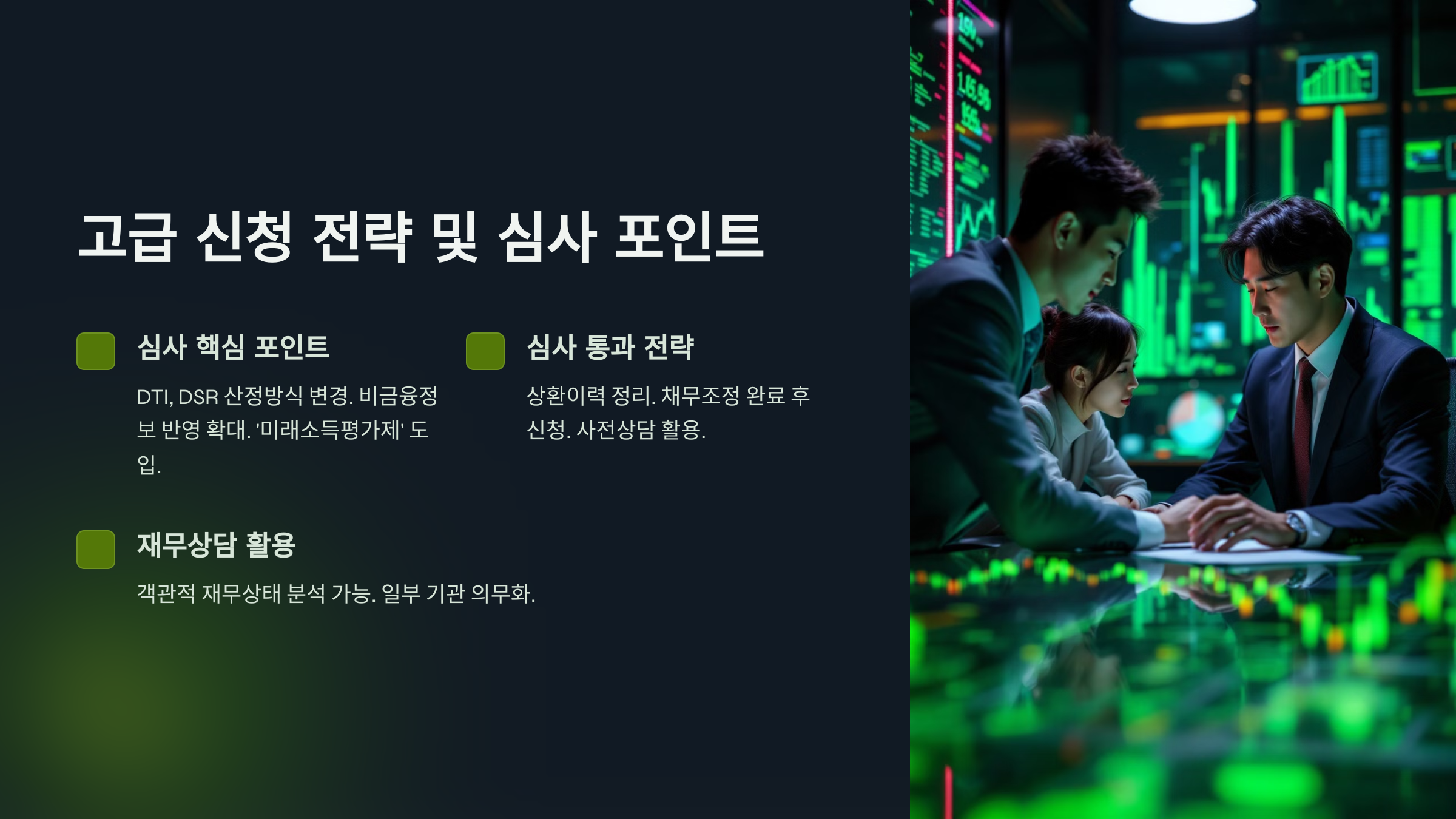 대환대출 심사에서 주목해야 할 핵심 포인트들이 있습니다. 첫째, DTI(총부채상환비율)와 DSR(총부채원리금상환비율)의 산정 방식이 변경되어, 실제 상환능력 평가가 강화되었습니다. 둘째, 신용평가 시 비금융정보(통신료, 공과금 납부실적 등)의 반영 비중이 확대되었습니다. 셋째, 향후 소득 발생 가능성을 평가하는 '미래소득평가제'가 도입되어, 현재 무직이더라도 향후 소득 창출 가능성이 높다면 대출이 승인될 수 있습니다.
