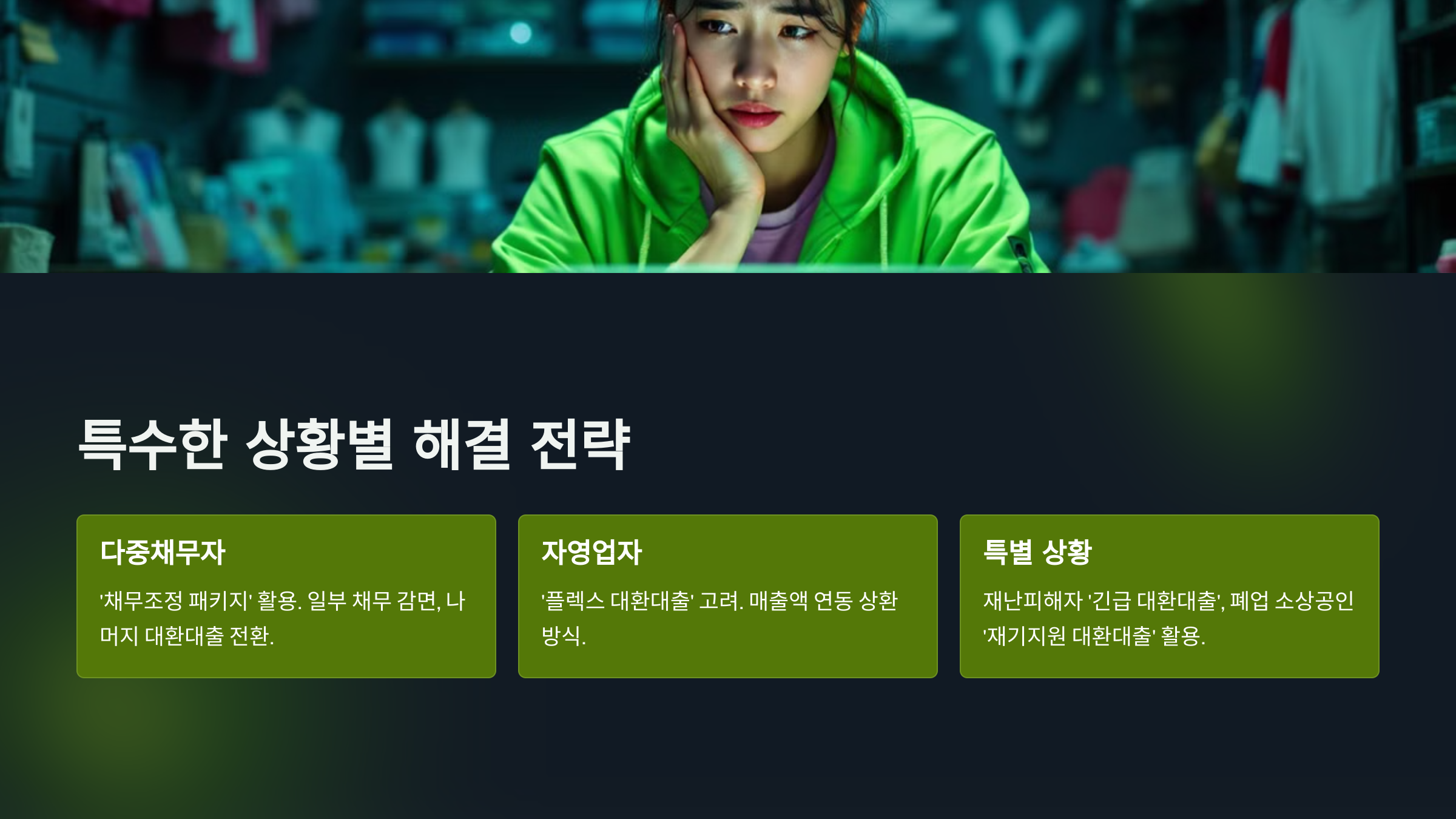 일반적인 대환대출이 어려운 특수한 상황에서의 해결방안도 있습니다. 다중채무자의 경우, 채무조정과 대환대출을 연계한 '채무조정 패키지'를 활용할 수 있습니다. 이는 일부 채무는 조정을 통해 감면받고, 나머지는 대환대출로 전환하는 방식입니다. 또한 자영업자의 경우, 매출액 연동 상환방식을 도입한 '플렉스 대환대출'을 고려할 수 있습니다.