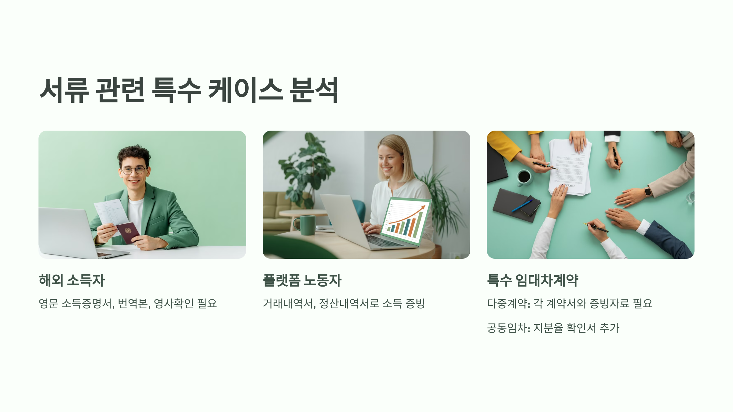 일반적이지 않은 상황에서의 서류 준비 방법도 알아야 합니다. 해외 소득이 있는 경우 영문 소득증명서와 함께 번역본 및 영사확인이 필요하며, 프리랜서나 플랫폼 노동자의 경우 거래내역서나 정산내역서로 소득을 증빙할 수 있습니다. 군인이나 공무원의 경우 재직증명서 외에도 복무확인서나 임용장 사본이 요구될 수 있으며, 유학생 귀국자의 경우 해외 학위증명서와 함께 경력증명서도 필요할 수 있습니다.
