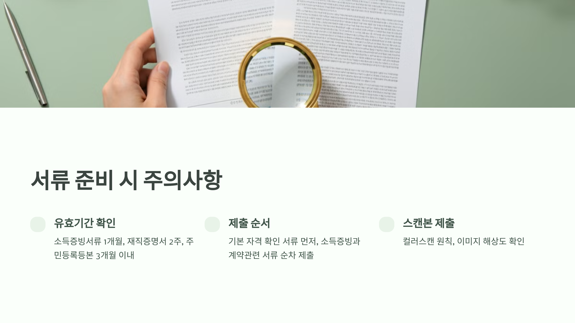 서류 제출 순서도 중요합니다. 먼저 기본적인 자격 확인을 위한 서류(신분증, 주민등록등본 등)를 제출한 후, 소득증빙과 계약관련 서류를 순차적으로 제출하는 것이 효율적입니다. 보완서류 요청에 대비해 여유분을 준비해두는 것이 좋으며, 스캔본 제출 시에는 컬러스캔을 원칙으로 하고 이미지 해상도도 확인해야 합니다. 또한 모든 서류는 원본 대조 확인이 가능하도록 준비해야 합니다.