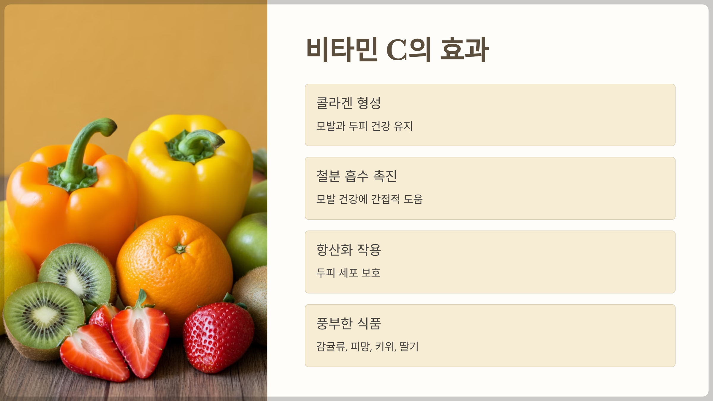비타민 C는 철분의 흡수를 돕고, 콜라겐 합성을 촉진해 모발과 두피 건강을 유지하는 데 중요한 역할을 합니다. 강력한 항산화제 역할을 하여 두피 세포를 보호합니다.