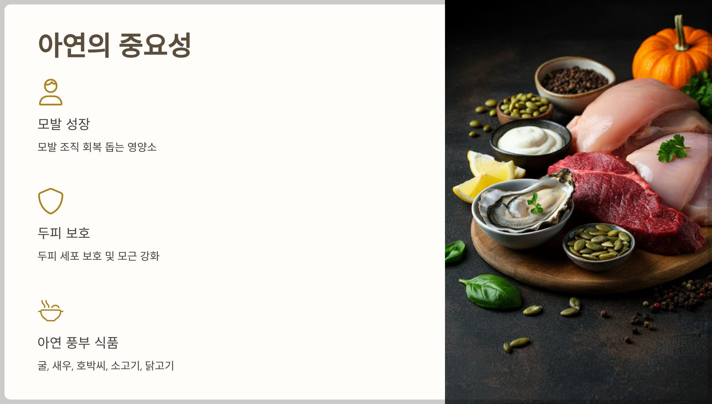아연은 모발 성장과 조직 회복을 돕는 영양소로, 아연이 부족하면 두피와 모발이 약해지고 탈모가 발생할 수 있습니다. 아연은 모발 손상을 줄이고 모근을 강화하는 데 중요한 역할을 합니다.