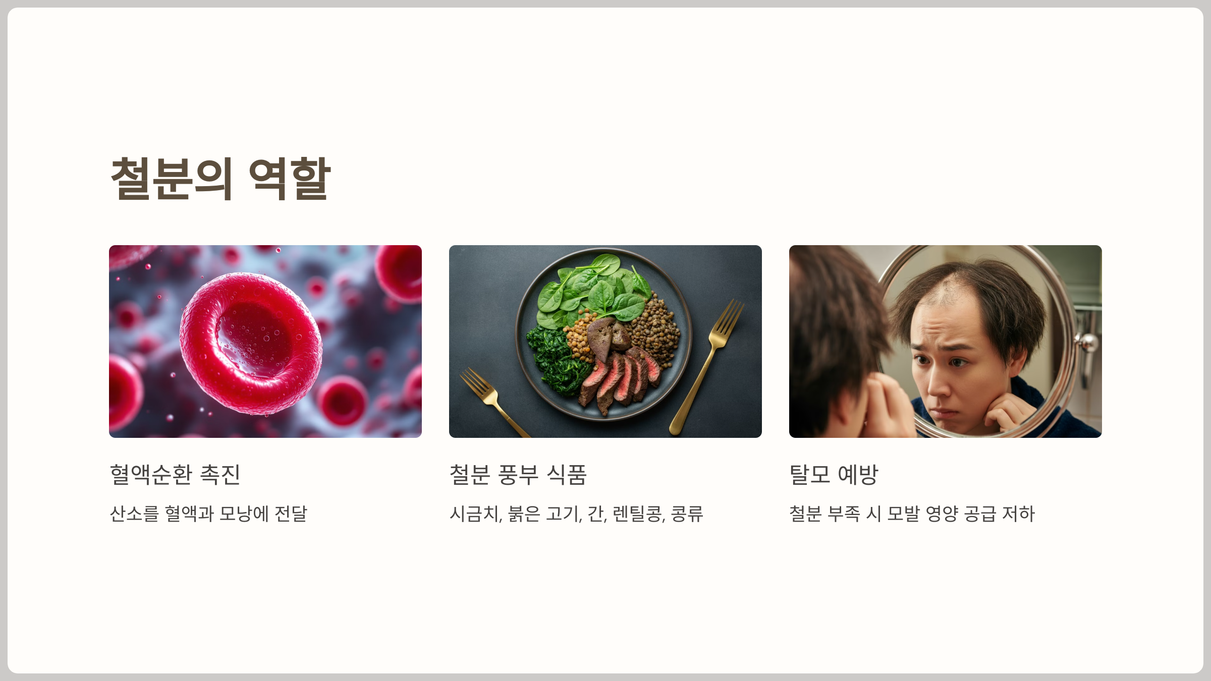 철분은 산소를 혈액과 모낭에 전달하는 데 중요한 역할을 합니다. 철분이 부족하면 혈액순환이 저하되어 모발에 영양이 공급되지 않으며, 이로 인해 탈모가 악화될 수 있습니다.