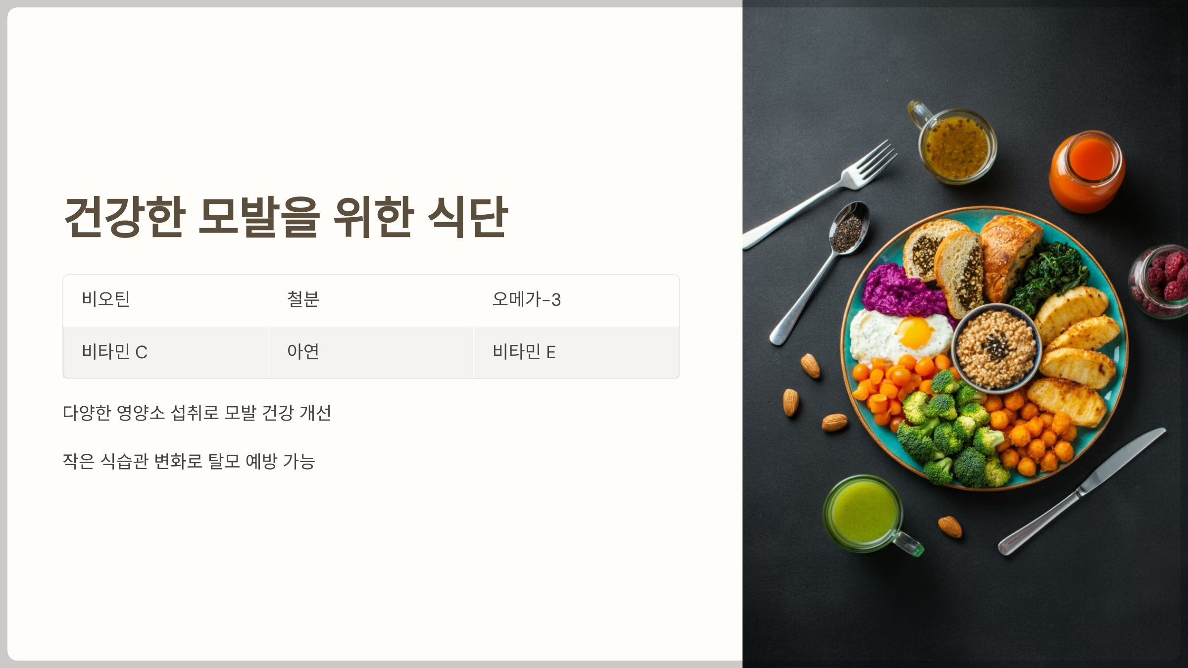 탈모 예방을 위해서는 올바른 영양소 섭취가 중요하며, 이를 위해 식단을 다양하게 구성하는 것이 좋습니다. 비오틴, 철분, 오메가-3 지방산, 비타민 C와 E, 아연 등이 풍부한 식품들을 꾸준히 섭취하면 모발이 건강해지고 탈모 예방에 큰 도움이 됩니다. 모발 건강을 지키기 위해 오늘부터 작은 식습관의 변화를 실천해 보세요.