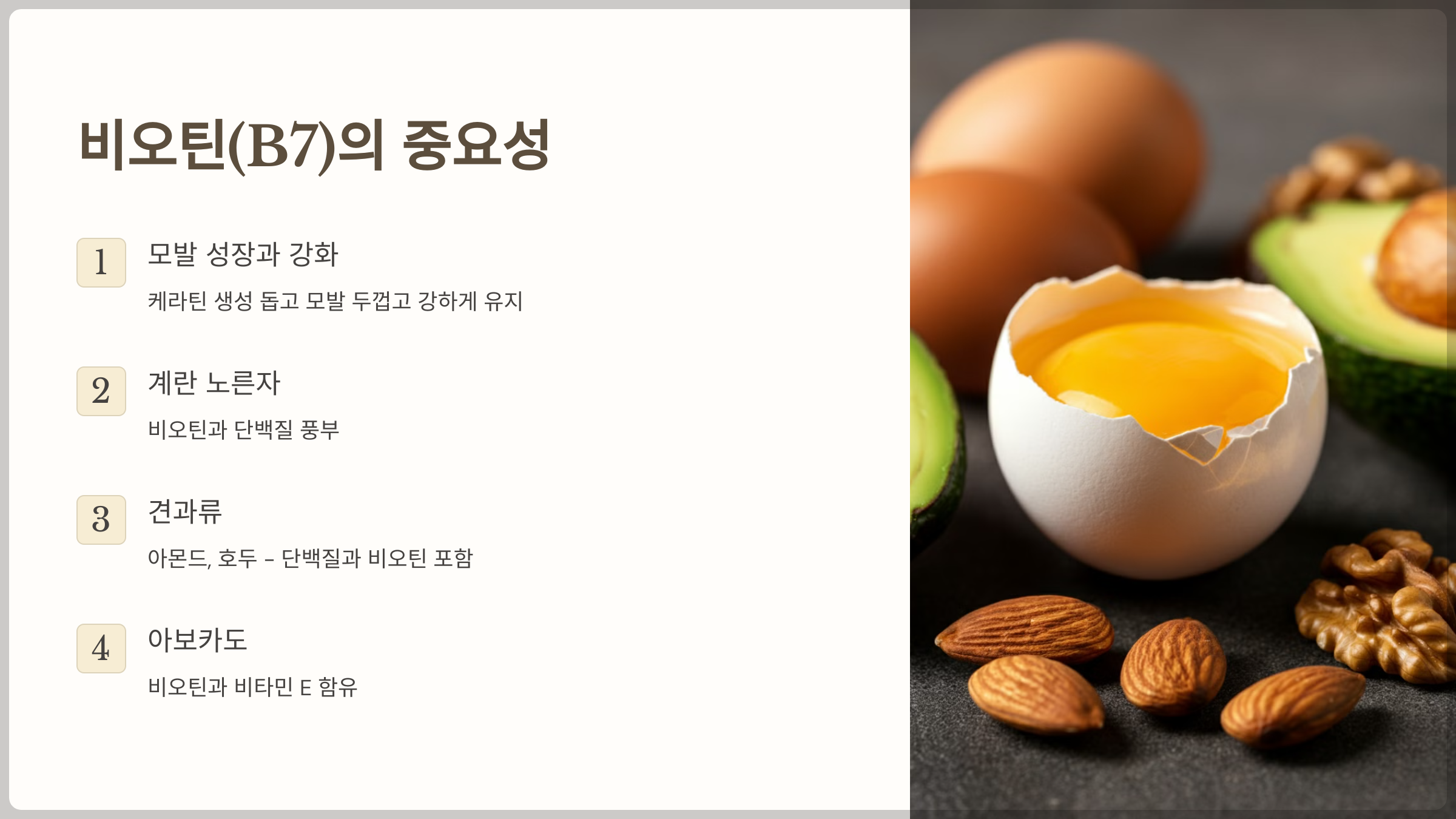 1. 비오틴(B7) – 모발 성장과 강화를 위한 필수 비타민