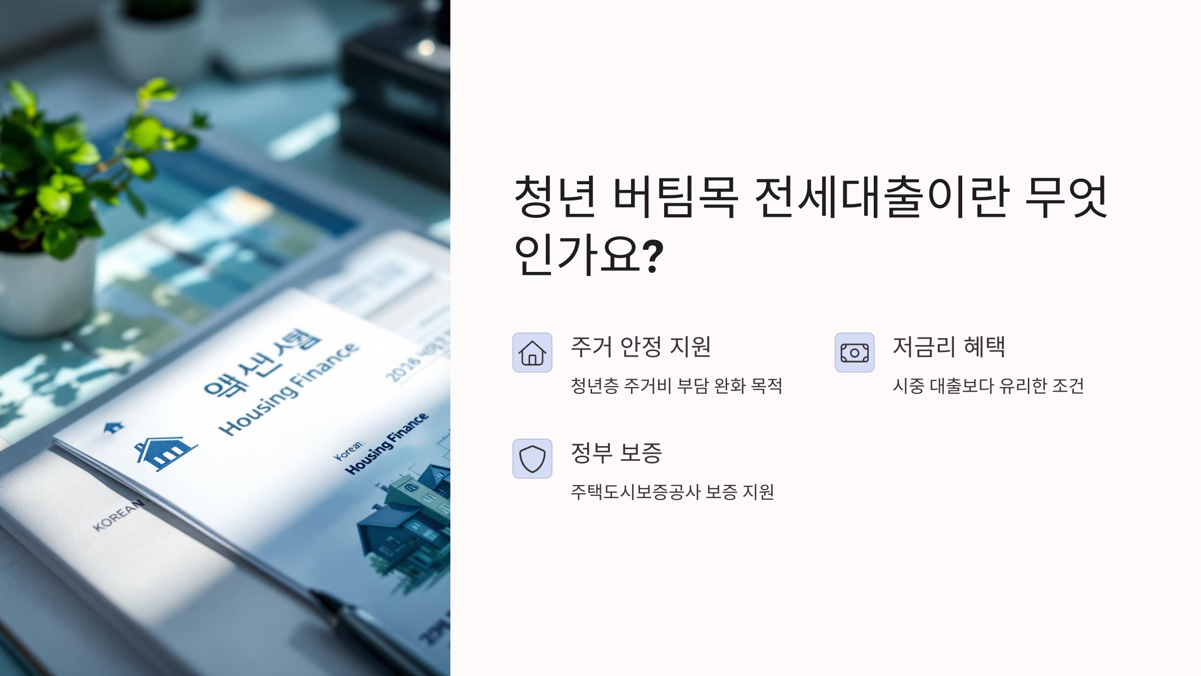 청년 버팀목 전세대출은 주택도시기금에서 지원하는 정책 금융 상품으로, 만 19세 이상 34세 이하의 무주택 청년들이 전세 주택을 구할 때 낮은 금리로 자금을 지원받을 수 있는 제도예요. 주택 구입이 아닌 전세 자금만을 위한 대출이라는 점이 특징이죠.