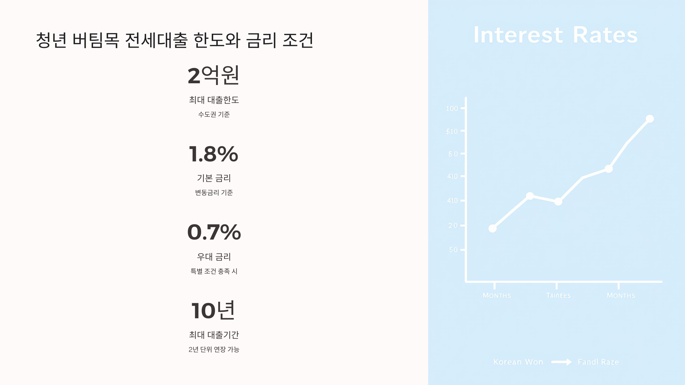 얼마까지 빌릴 수 있고, 이자는 얼마나 내야 할까요? 청년 버팀목 전세대출의 한도와 금리 조건을 자세히 살펴보겠습니다.