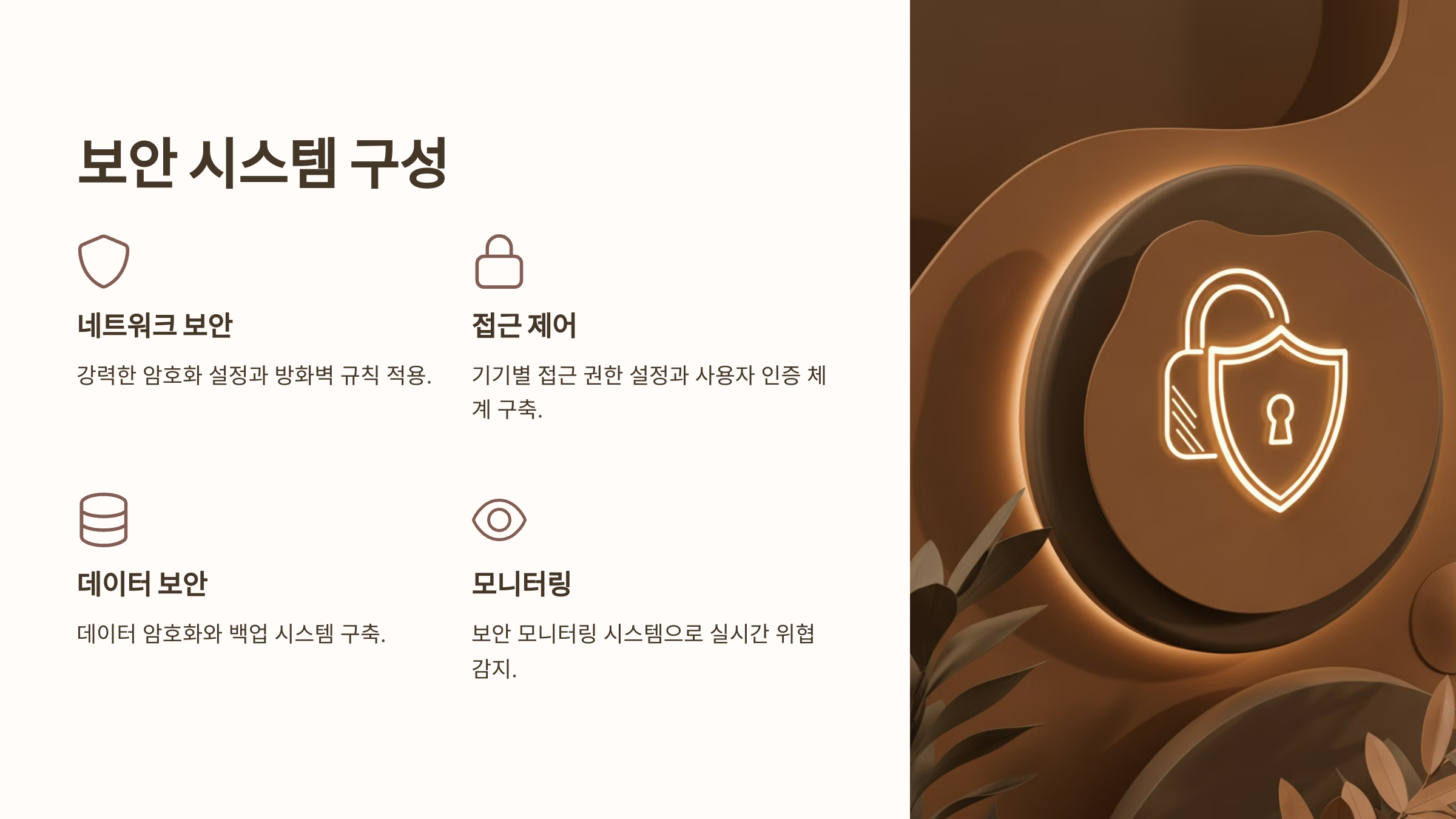 네트워크 보안이 가장 기본적입니다. 강력한 암호화 설정과 방화벽 규칙을 적용합니다. 기기별 접근 권한 설정과 사용자 인증 체계를 구축합니다. 정기적인 보안 업데이트 일정도 수립해야 합니다.