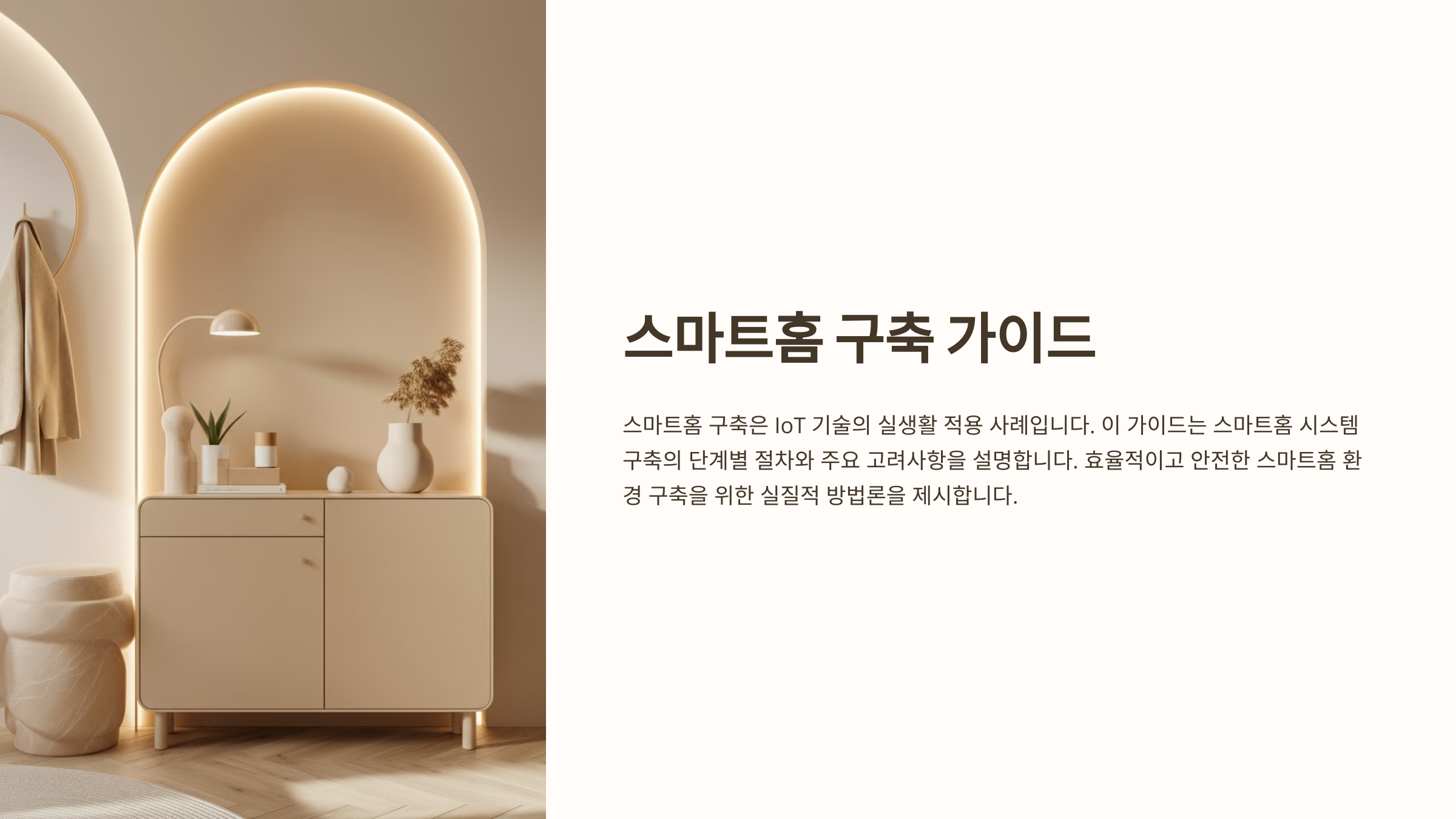 스마트홈 구축은 IoT 기술의 기본 개념을 실생활에 적용하는 대표적인 사례입니다. 이 가이드에서는 스마트홈 시스템 구축을 위한 단계별 절차와 주요 고려사항을 상세히 설명합니다. 효율적이고 안전한 스마트홈 환경을 구축하기 위한 실질적인 방법론을 제시합니다.