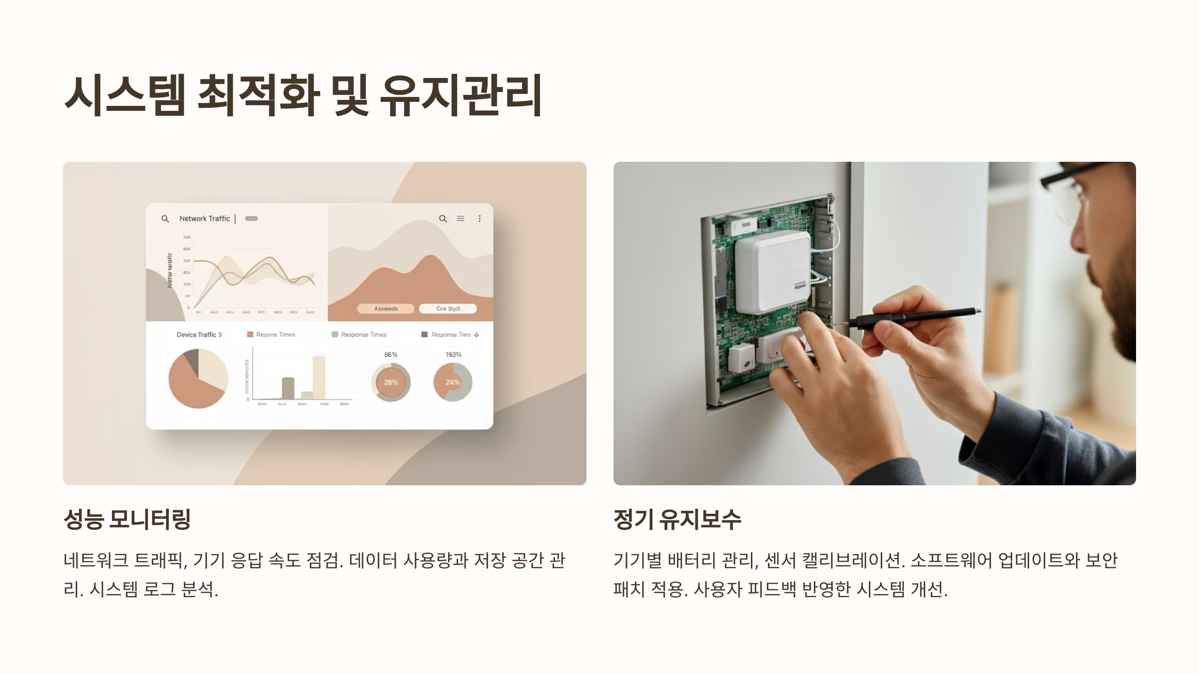 시스템 성능 모니터링이 필수적입니다. 네트워크 트래픽과 기기 응답 속도를 주기적으로 점검합니다. 데이터 사용량과 저장 공간을 관리합니다. 시스템 로그 분석으로 잠재적 문제를 파악합니다.